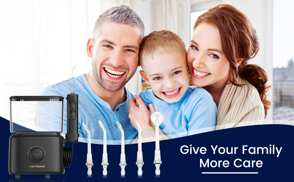 The zerhunt water flosser is equipped with 3 color-coded classic nozzles and 4 functional tips for using by different family members. Improving the dental problems of the whole family together.